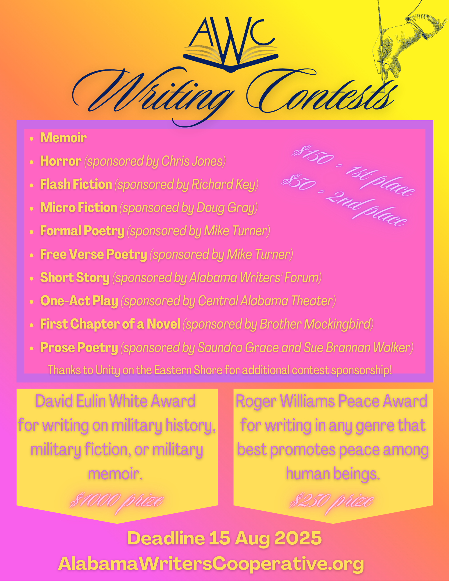 · Short Story (limit 1500 words), sponsored by Alabama Writers' Forum